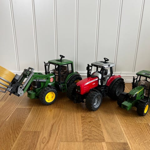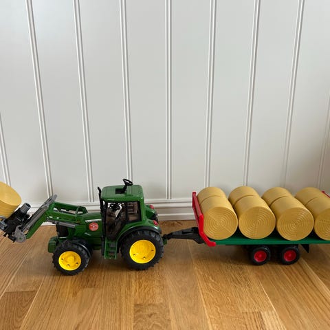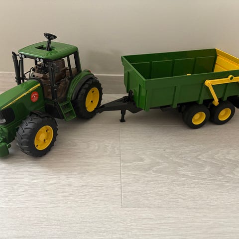 Bruder traktor leke i grønn plast med frontlaster. Modellen har førerhus, store gule hjul og bevegelige deler foran for lasting og tipping. Egnet som leketraktor for barn som liker landbruk og anlegg. Laget i plast med detaljer som ratt, sete og lys bak. Passer til innendørs lek på gulv eller bord.