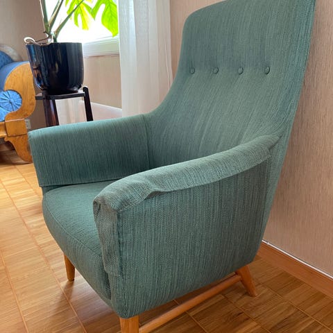 Sits lenestol i grønt tekstil. Stolen har høy rygg med knappestikninger, polstret setepute og avrundede armlener. Treramme med ben i treverk. Passer som sitteplass i stue, lesehjørne eller tilsvarende oppholdsrom.