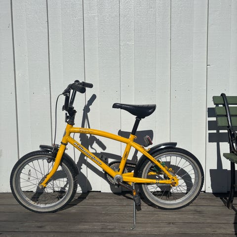 Barnesykkel med 16" hjul i gull farge. Sykkelen har rett styre med holker, sete med fjæring og bagasjebrett bak. Den er utstyrt med skjermer foran og bak samt pedaler med refleks passer til barn som er rundt 4-5år