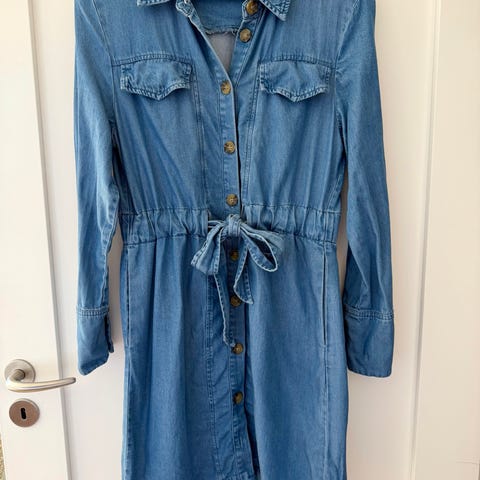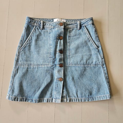 Arnie Says olaskjørt i denim for dame i størrelse XS. Skjørtet er i blå denim med knappelukking hele veien foran og beltehemper i linningen. Klassisk A-formet fasong med sømdetaljer foran og bak.