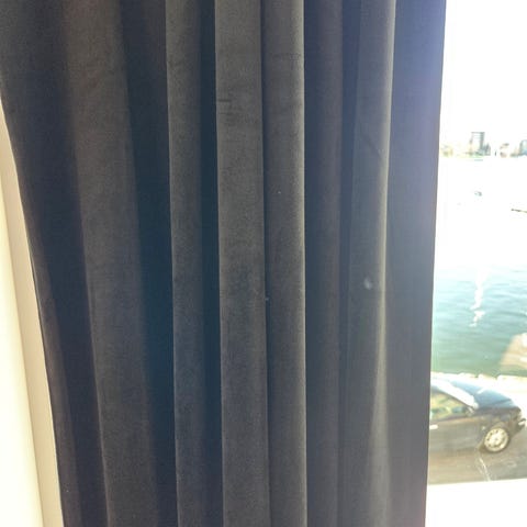 IKEA gardiner i mørk farge med brede, vertikale striper i ulike nyanser. Gardinene har maljer øverst for oppheng på gardinstang. Egner seg til stue, soverom eller andre rom der man ønsker å dempe lysinnslipp og skape en mørkere atmosfære. Passer til standard vinduer; mål og materiale kan kontrolleres ved overtakelse.
