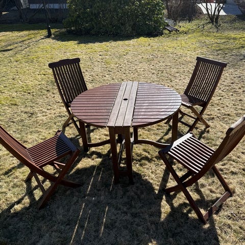 Rundt hagebord med fire stoler.