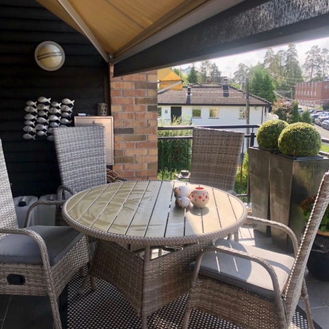 Passer til bruk på terrasse, balkong eller i hage som spise- og sittegruppe utendørs.