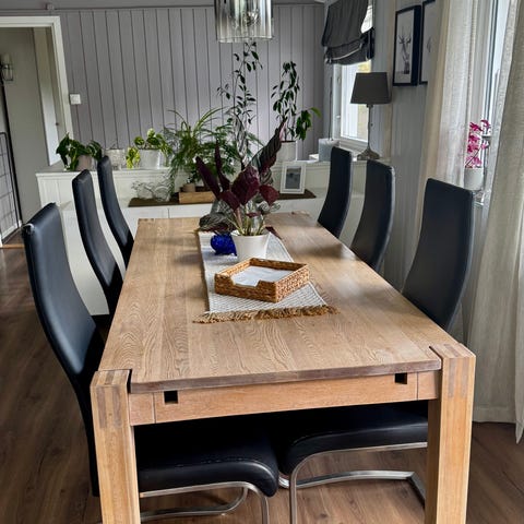 Følger med 6 spisestoler i skinn. Disse bærer preg av katten i hus. Se bilde.