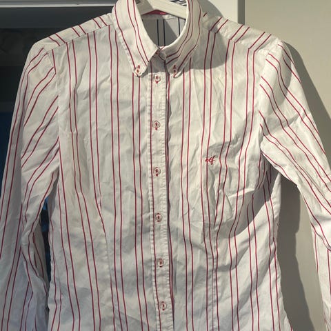 DAY Birger et Mikkelsen skjorte for dame i størrelse 42. Skjorten er laget av bomull og har vertikale striper i flere farger med hovedinntrykk av rødt og hvitt. Modellen har lange ermer, mansjetter med knapp og klassisk krage. Lukkes med knapper i front. Passer til hverdagsbruk eller jobb, og kan kombineres med både bukser og skjørt.