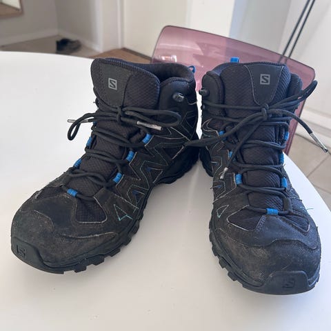 Skoene er som nye, uden huller eller slid, sålerne inklusivt. Kun brukt 2 gange, da de var for små. Desværre har de lidt mudder pletter.