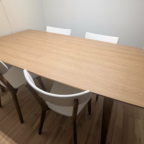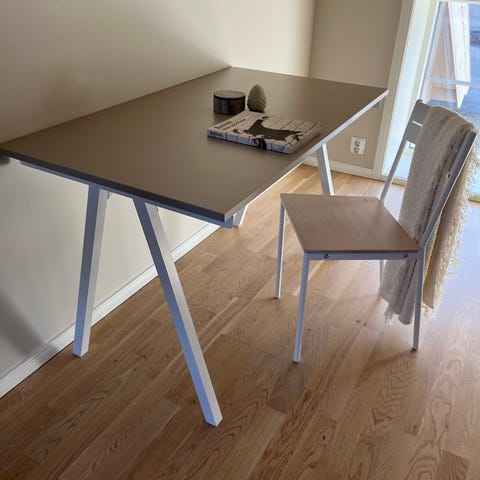 Bordet er nærmest helt nytt og må selges ettersom at vi har flyttet og trenger et rundt istedenfor. Mål finner du på ett av bildene.