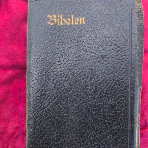 Bibelen Ressurs bibel i svart omslag. Innbundet utgave med gullsnitt på sidene. Inneholder standard bibeltekst med ekstra ressurssider for notater og studier. En side foran i boken er påført navn og årstall med penn. Egner seg til personlig bruk, studier og andakter.