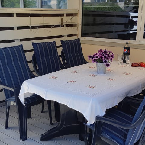 Plast hagebord i rektangulær form i mørkeblå farge. Bordet har fire ben og en stabil ramme i plast. Kvalitetsbord fra Jysk. Det er hull i midten av bordplaten til parasoll. Egnet som utebord på terrasse, balkong eller i hagen. Lengde 180 cm, bredde80cm, høyde 72 cm