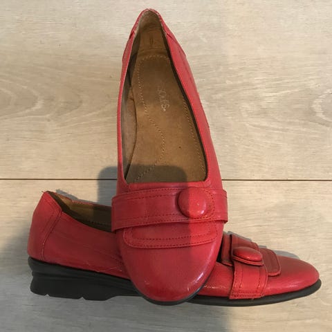 Topshop ballerinasko i størrelse 39. Skoene er i burgunderfarget lakkmateriale med T-stropp og justerbar spenne over vristen. Overdelen har utskårne detaljer foran, og sålen er flat med lett mønster for grep. Egner seg som hverdagssko eller til penere anledninger.