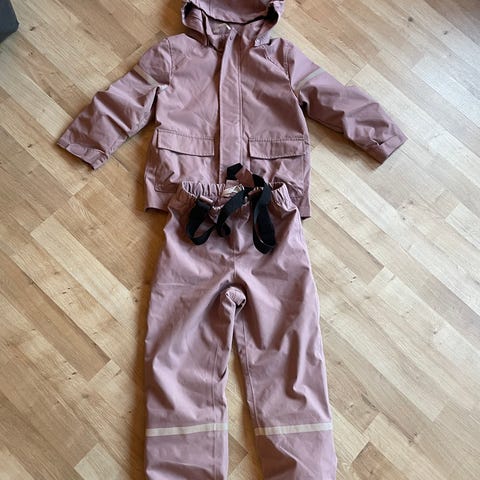 Reflex regnsett for barn i størrelse 92. Settet består av jakke og selebukse i rosa polyester. Buksen har forsterkede knær, strikk nederst i bena og fotstropper. Jakken har avtakbar hette og refleksdetaljer på både jakke og bukse. Unisex-modell egnet til bruk i vått vær og utelek.