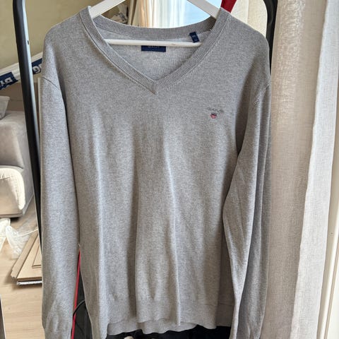 Gant genser for herre i størrelse M. Genseren er grå og laget av bomull. Klassisk modell med rund hals og ribbestrikkede kanter. Passer til hverdagsbruk og kan kombineres med både jeans og chinos.
