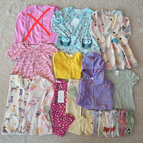 Anmerkninger: hetten til regnjakken mangler. Ellers kan noen små flekker og nupper forekomme, men stort sett er alle klærne i perfekt stand, og alt har mye god bruk igjen 🌸