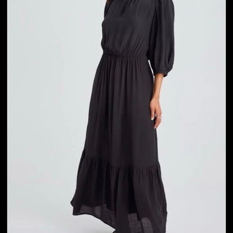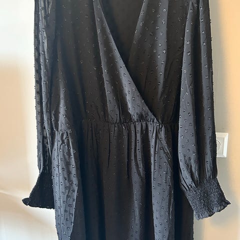 Svart sommerkjole fra Ellos. Størrelse 46/48. Beskrivelse lånt fra nett: "Lang kjole i rynket jersey. Elastisk vaffelsøm ved midjen. Bred, elastisk hals med volang og knytbar tråd. Elastiske ermeender. Kvalitet: Trikot. Materiale: 95% Polyester, 5% Elastan. Passform: Regular." Har foreløpig kun bilder lånt fra nett. Fra røykfritt og dyrefritt hjem. Nypris var kr. 549,-. Prisen er ferdig prutet. Kun Vipps betaling.