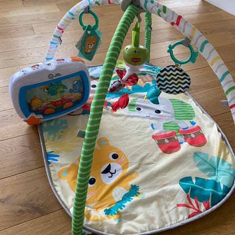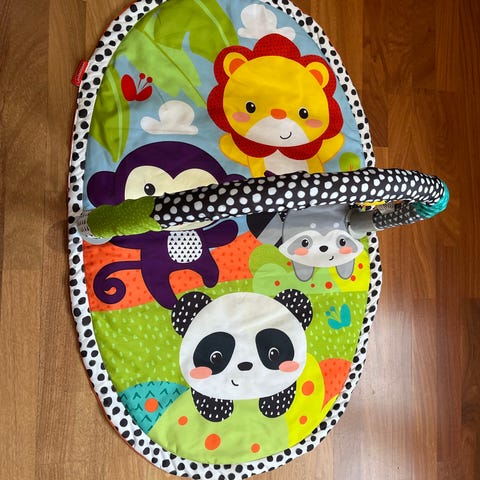 Babygym leketeppe med fargerikt dyremotiv. Teppe med polstret underlag og to buer som krysser hverandre. Flere hengende leker er festet i buene for å stimulere barnets sanser og motorikk. Passer til spedbarn som trenger en myk og trygg plass for lek og aktivitet på gulvet.
