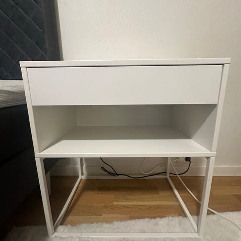 Vikhammer nattbord i hvit utførelse. Bordet har en åpen, firkantet ramme, én skuff øverst og en åpen hylle under for oppbevaring. Egnet som nattbord ved seng eller som lite sidebord i stue eller andre rom der det er behov for ekstra avlastningsplass og oppbevaring av mindre gjenstander.