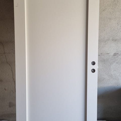 Innvendig dør i hvit utførelse. Glatt dørblad med enkel profil og standard dørhåndtak. Passer som romdør innendørs i bolig eller kontor.