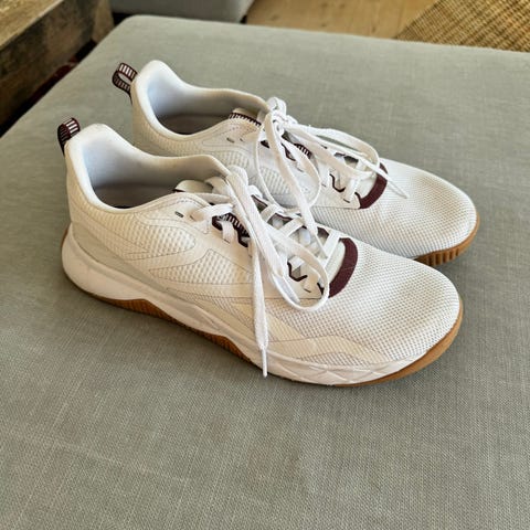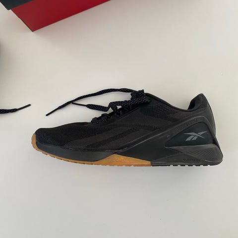 Reebok Lifter treningssko i størrelse 43. Skoene er i svart farge med kontrastdetaljer og har kombinasjon av lisser og borrelås for ekstra stabilitet. Overdelen er i syntetisk materiale med perforeringer for ventilasjon. Sålen er flat og stabil med forhøyet hæl, egnet for styrketrening og annen innendørs trening der det er behov for god støtte og stabilitet.