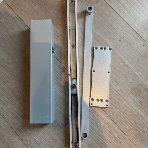Dørpumpe i metall, sølvfarget utførelse. Mekanisk dørpumpe med arm og justeringshjul på fronten for regulering av lukkehastighet. Egnet for montering på innvendige eller utvendige dører der man ønsker kontrollert lukking av døren. Merke og nøyaktig modell er ikke spesifisert.
