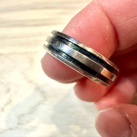 Selger en pent brukt herrering. Ingen stempler eller navn. Str 62. Den er 0,8 cm bred og er i gull og sølv farger.