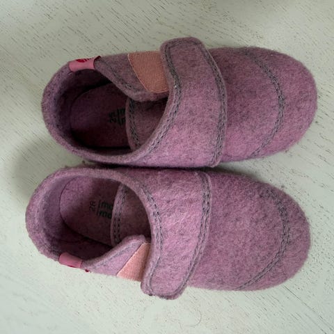 Tøfler som kun har vært prøvd på hjemme et par ganger. Var for små da hun fikk de. Bestemor trodde de var strl 7-8 år 😅. Det står 24/25 , men har målt mot tøfler og sandaler i strl 26 og de er akkurat like lange så store i strl.