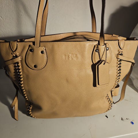 Vesken har messingnagler (studs) langs vertikale skinnreimer og doble bærehåndtak med dekorativ Coach-logo-tag i skinn.