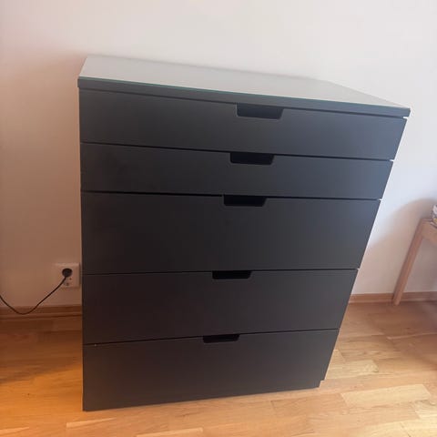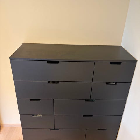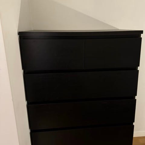Selger mine 2 malm kommoder pga oppussing. Ser ikke ut til at disse selges i svart lenger. Hele og pene. Bakplata på den ene har fått en revn i seg etter flytting. Men ingenting å si for funksjonen. Ellers noen få små chipper nederst(se bilder). Men minimale. Liten skade på sokkelen i front på den ene(syns veldig lite). Hele og fine i skuffene. Bruksmerker kan forekomme. Nypris er 1995kr. Selges for 750kr per stk. eller 1400kr for begge. Hentes på Nesodden