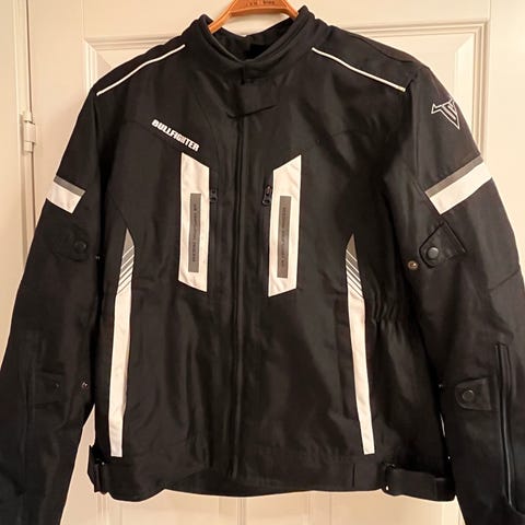 Passer som ytterjakke til motorsykkelkjøring i varierende værforhold. Størrelse og passform er merket som M på innsiden av kragen.