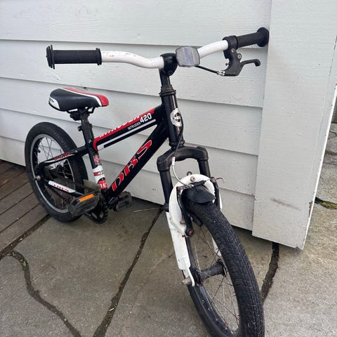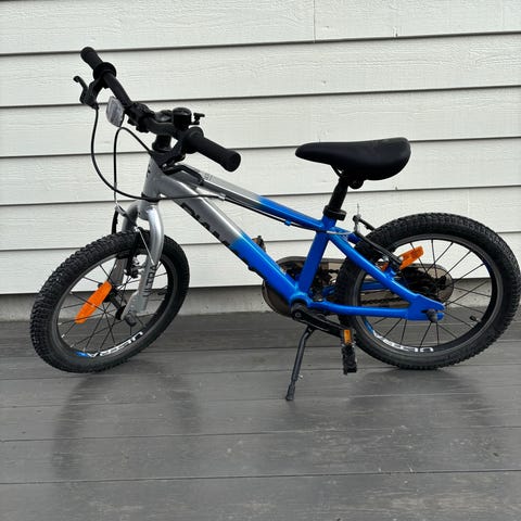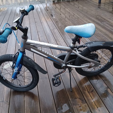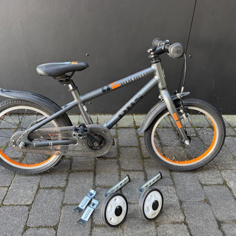 DBS barnesykkel med 16" hjul i grå og blå farge. Sykkelen har lett ramme tilpasset barn, rette styreholker med håndbremser foran og bak, samt komfortabelt sete. Passer til barn som trenger en mindre sykkel med 16-tommers hjul til bruk på asfalt og lette grusveier.
