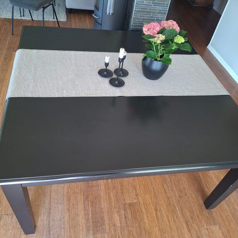 Helt og solid spisebord med 2 ileggsplater. 160•105 cm. Hver ileggsplate er 40cm. Godt brukt. Trenger litt puss og malingsstrøk!!