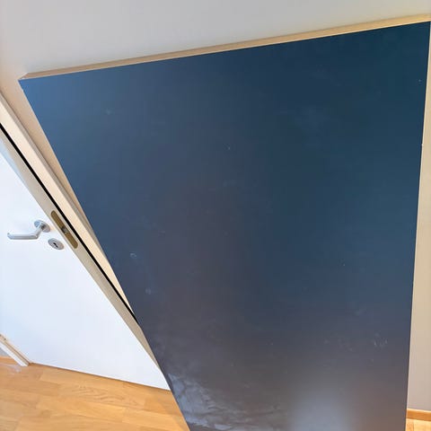 Pent brukt skrivebord med fire hvite bein selges. Bordet er demontert, og skruer følger ikke med. Hentes