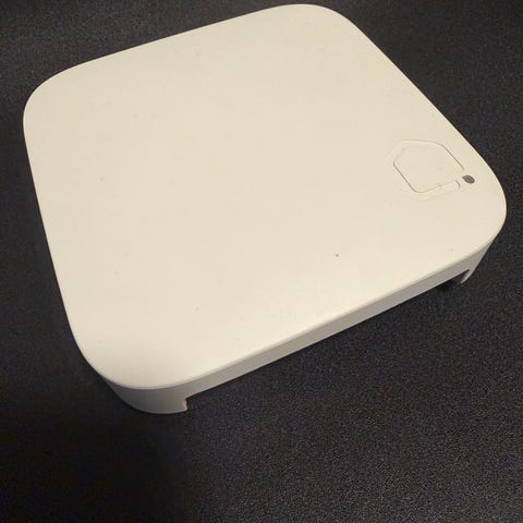 Enheten er en mesh-ruter/nodemodul i hvit farge. På undersiden står modellnavn «Omni lite» med strømtilførsel 9V – 1A. Enheten har strømtilkobling, to nettverksporter (LAN/WAN) samt indikatorlampe. Baksiden har festeanordning for veggmontering.