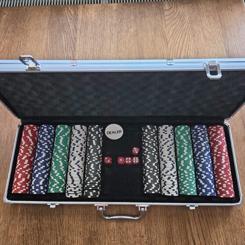 Svært lite brukt pokersett med 500 sjetonger. Flere av sjetongene ligger fortsatt i plasten.