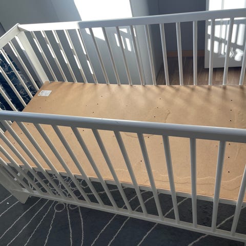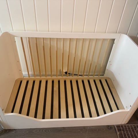 Merk: Én lamell i bunnen mangler (ble ødelagt), men dette har ingen praktisk betydning – med madrass merkes det ikke i bruk.
