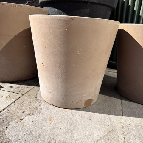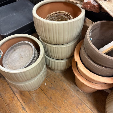Ukjent merke blomsterpotter for utendørs bruk i terrakotta, brun farge. Flere potter i ulike fasonger og størrelser, egnet til planting av blomster, busker eller mindre trær. Pottene har dreneringshull i bunnen og kan brukes på terrasse, i hage eller ved inngangsparti. Passer til bruk med jord og ulike typer prydplanter. 500 kr. for alle.