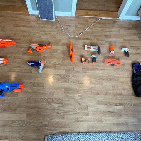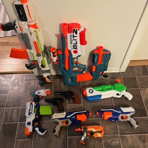 Nerf leker våpensett i plast. Settet består av flere ulike Nerf-blastere i forskjellige størrelser og farger, egnet som leker for barn.