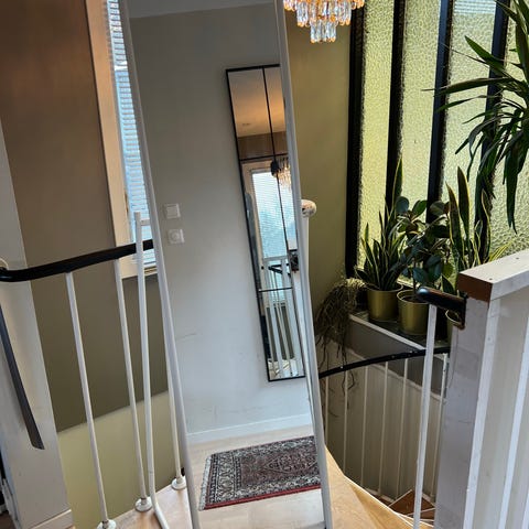 Gulvspeil av typen KNAPPER fra IKEA. Har mulighet for heng av klær og andre ting bak speilet.