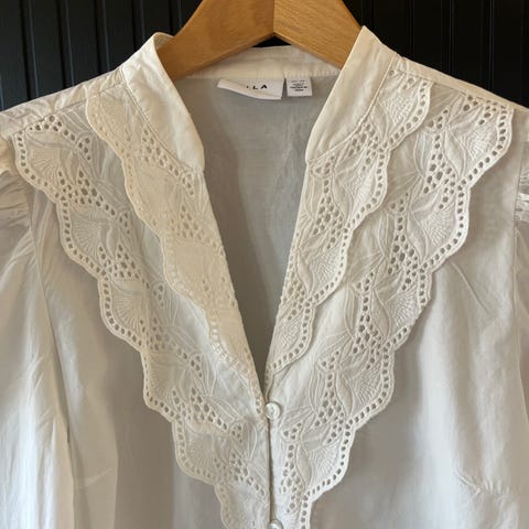 Lett, feminin hvit bluse med snøring i livet. God til sommerbruk — pent brukt og uten synlige flekker.