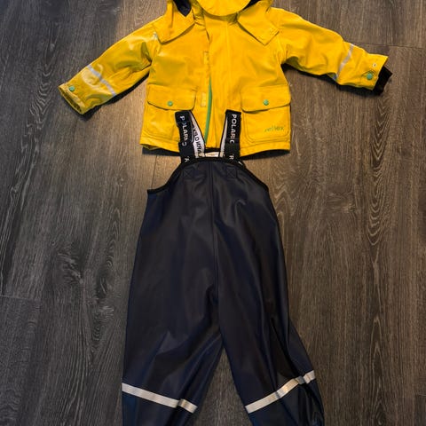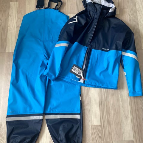 Brukt regntøy. Foret. Veldig bra på høst og vår. Ingen lekkasjer og har inntakte strikker på beina.