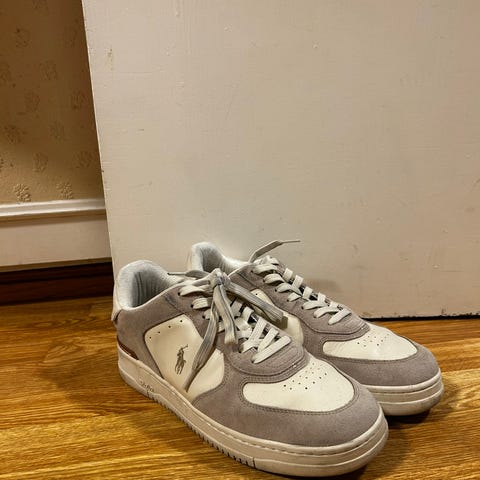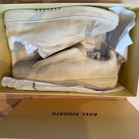 Axel Arigato sneakers/joggesko i størrelse 42. Modellen har overdel i hovedsakelig hvitt og grått med oransje detalj på hælen. Lav modell med snøring og perforerte detaljer på siden for bedre ventilasjon. Kraftig gummisåle med Axel Arigato-logo under. Passer som hverdags- og fritidssko.