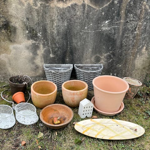 Diverse blomsterpotter i keramikk og terrakotta i ulike størrelser og fasonger.