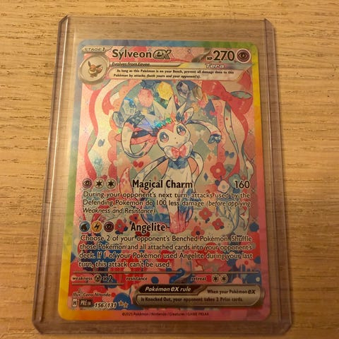 Pokémon Sylveon VMAX samlekort. Kortet viser Sylveon VMAX med angrepene Precious Touch og Max Harmony. Standard Pokémon-bakside. Egnet for samling eller spill i Pokémon Trading Card Game.