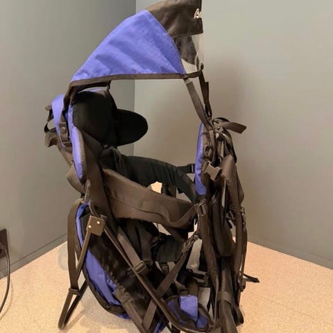 Saddle Baby ryggsekk bæremeis. Den har flere utvendige lommer i netting og justerbare stropper.