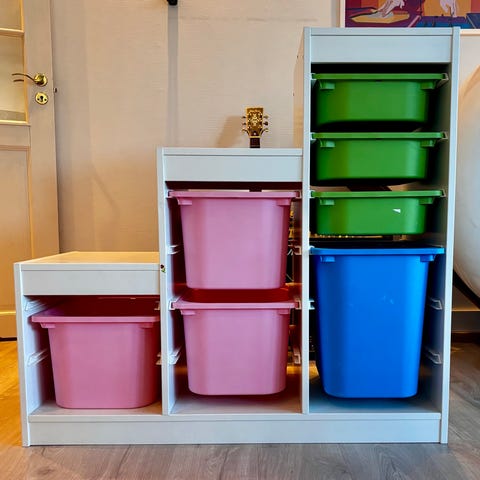 Møblene er egnet til oppbevaring av barneklær, leker og annet utstyr på barnerom. Noen mindre merker/slitasje kan forekomme på håndtakene, se bilder for detaljert tilstand.