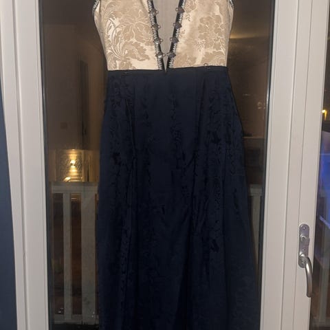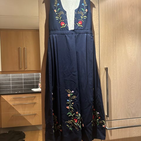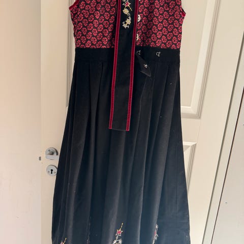 Pent brukt, og pent brodert, bunad fra Husfliden i Stavanger, Løland. Hel lengde er 132 cm, lengde på stakk er 94 cm, kan ikke legges mer ned. Rødt brokadeliv er 36 cm, som kan syes ut både i bredden og lengden (se bilde). Omkrets liv/ lengde beltet slik bunaden er nå er ca 76 cm. Størrelse er S/M. (Tidligere eier er ca 163 cm høy.) Selges med sølv som på bildet, 5 par maljer på livet, beltespenne, mansjetter og sjalspenne, alt i Otteren hvitt gravert sølv. Vesken har væskelås i plett, det er litt sterkere mtp bruk enn rent sølv. Lue følger også med (aldri brukt-). Totalverdi av sølvet i dagens pris er rundt kr 10 000,- . Alle bunader må tilpasses den som skal bruke den -