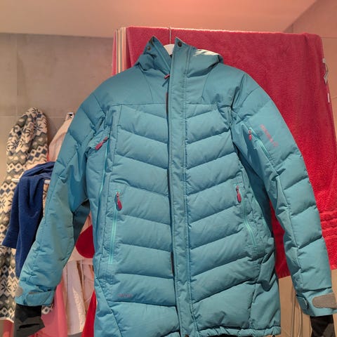 Norrøna dun vinterjakke for dame i størrelse L. Jakken er grønn med kontrastfelt øverst og har gjennomgående kanaler med dunfyll som gir jevn isolasjon. Modellen har hette, hel glidelås foran og er utviklet for bruk i kalde vinterforhold. Yttermaterialet er vattert og fylt med dun for varme og komfort. Passer til hverdagsbruk og utendørsaktiviteter i vinterhalvåret.