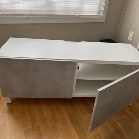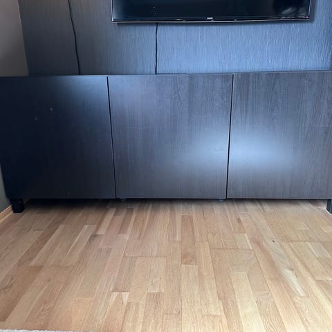 Lite brukt tv-benk med stående trestruktur i fargen brunsort. 2 stk. skuffer og 4 stk. bein. Ny 2022.