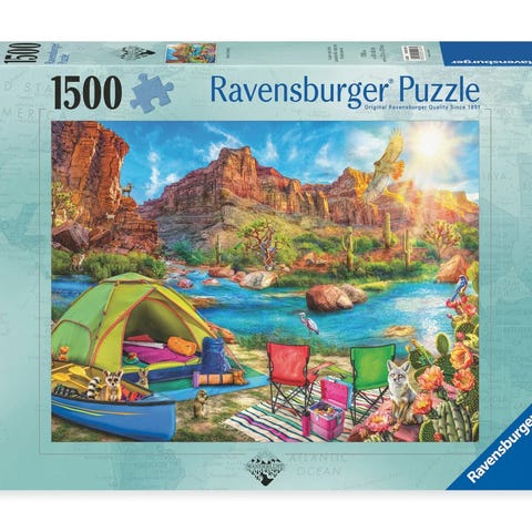 Ravensburger puslespill med motiv av fargerikt campinglandskap ved elv og fjell. Puslespillet består av 1500 brikker og viser telt, campingstoler, elv og klipper i sterke farger. Egnet for puslespillentusiaster som ønsker et motiv med mange detaljer og naturtema. Brikkene er laget i papp/kartong og leveres i original eske med bilde av motivet på lokket.