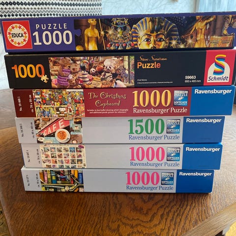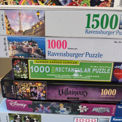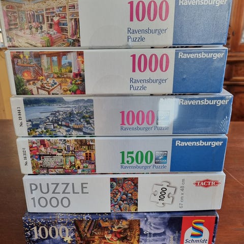 Ravensburger puslespill med 1000 brikker per eske. Bildene viser en samling ulike motiver, blant annet dører i New York, Disney-filmplakater, The Flintstones og et julekjøkken. Puslespillene passer for ungdom og voksne som liker detaljerte motiver og pusling over lengre tid. Kan brukes alene eller sammen med familie og venner som en rolig innendørsaktivitet.