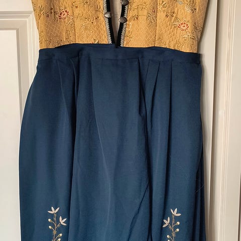 Sort Frafjord bunad med klassisk ulldamask stakk. Med hårbøyle istedet for kyse. Fløyelsbelte på 92 cm. Livvidde ca 86cm. Total lengde på bunaden fra skulder og ned er 149cm. Passer til en på ca.175cm